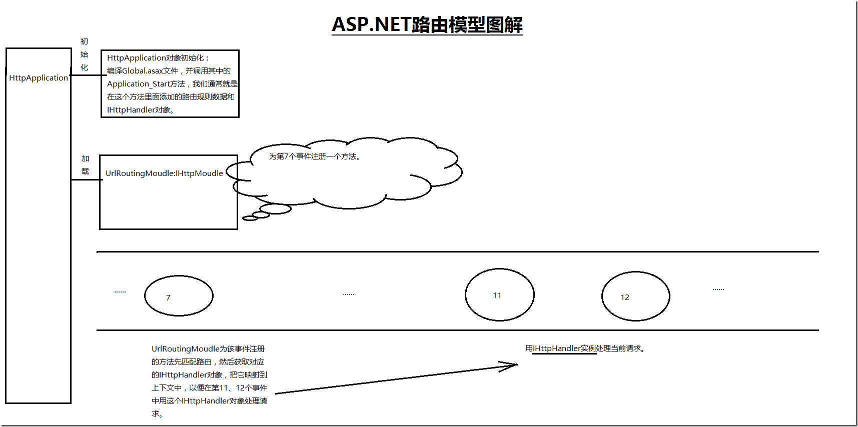 我们再整理下思路:ASP.NET先注册了UrlRoutingModule模块,他就是一个实现了IHttpModule接口的类,其Init方法就是在第7个事件上注册一个方法,该方法先匹配路由,如果匹配成功了,则用匹配结果RouteData中的IHttpHandler对象映射到当前上下文中,这样在之后第11、12个事件之间就会调用这个IHttpHandler对象处理请求。