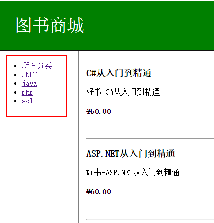 参数增加了一个 category,用于获取分类的字符串,对应 Books 中的属性的赋值语句改为_bookRepository.Books.Where(x => category == null || x.Category == category),这里的 Lambda 表达式x => category == null || x.Category ==category 的意思是,分类字符串为空就取库中所有的 Book 实体,不为空时根据分类进行对集合进行筛选过滤。