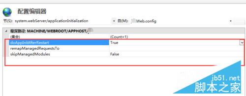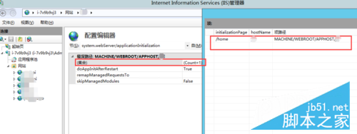 在左上角配置节点选择system.webServer/applicationInitialization,其他配置如红圈中,如下图所示: