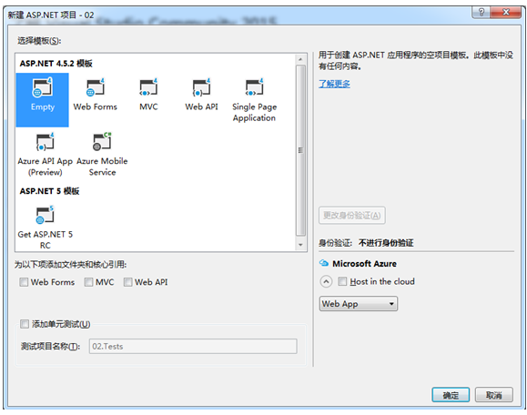 (2)单击“确定”按钮,将弹出选择项目类型对话框,在该对话框中可选择Web Forms或MVC等项目类型,这里选择“Empty”空项目类型,然后点击确定按钮,如图12.2所示。