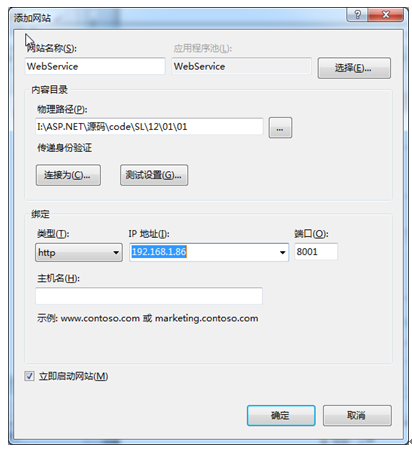 (1)首先打开IIS管理工具,在IIS管理工具中“网站”的节点下创建一个网站,目录指定已经编写好的Web服务应用程序文件夹,然后命名网站名称并分配IP地址和端口号。这个过程同创建网站站点相同,最后点击“确定”按钮完成创建,如图12.6所示。
