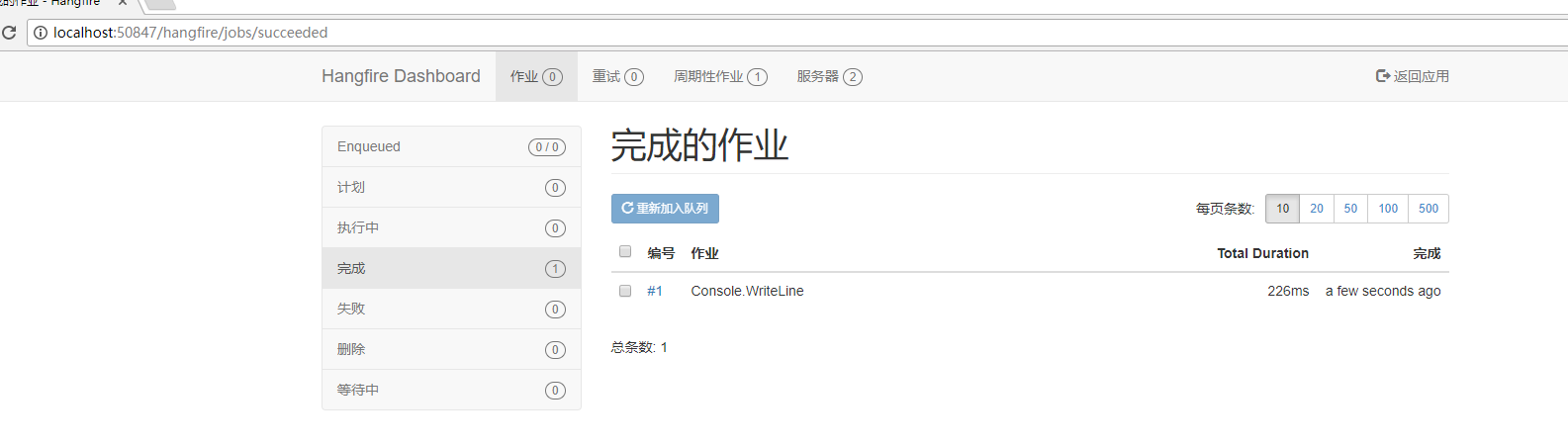 我们打开如下地址,可以看到hangfire的作业控制面板,现在开没有任何作业