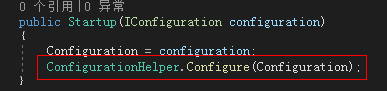 我们需要将配置信息注入到类库项目,需要使用ConfiurationHelper类下的静态方法。在创建的.Net Core Web应用程序的Startup文件中调用Configure方法,使用前不要忘了先引用类库项目
