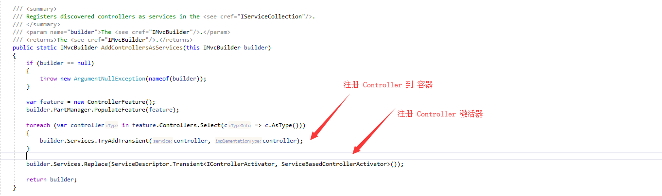 可以通过调用 AddControllersAsServices() 方法来让 Controller 使用自带容器,其主要源代码如下