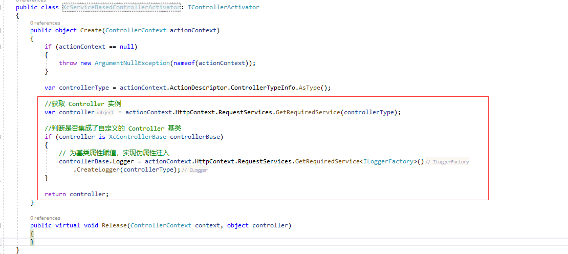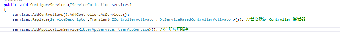 services.AddControllers().AddControllersAsServices(); services.Replace(ServiceDescriptor.Transient<IControllerActivator, XcServiceBasedControllerActivator>()); //替换默认 Controller 激活器