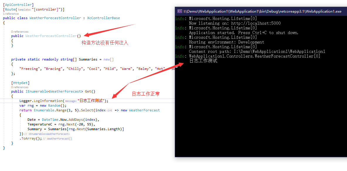 在上面的Controller基类注入 ILogger,然后设置了 Logger 属性,这样子类就可以使用 Logger 属性来使用日志。