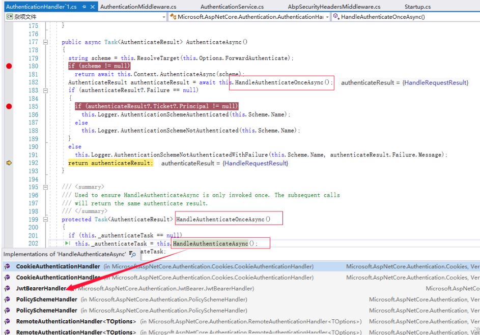 这里其实就是我们在前面讲的根据Scheme获取对应的AuthenticationHandler,然后调用AuthenticateAsync()方法,这个方法调用了核心方法HandleAuthenticateOnceAsync,然后再调用HandleAuthenticateAsync()这个核心的认证方法。