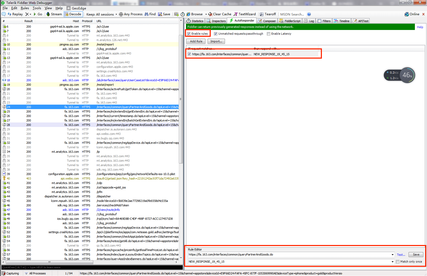 1. 抓包,找到要拦截的请求,然后在AutoResponder中Add Rule: