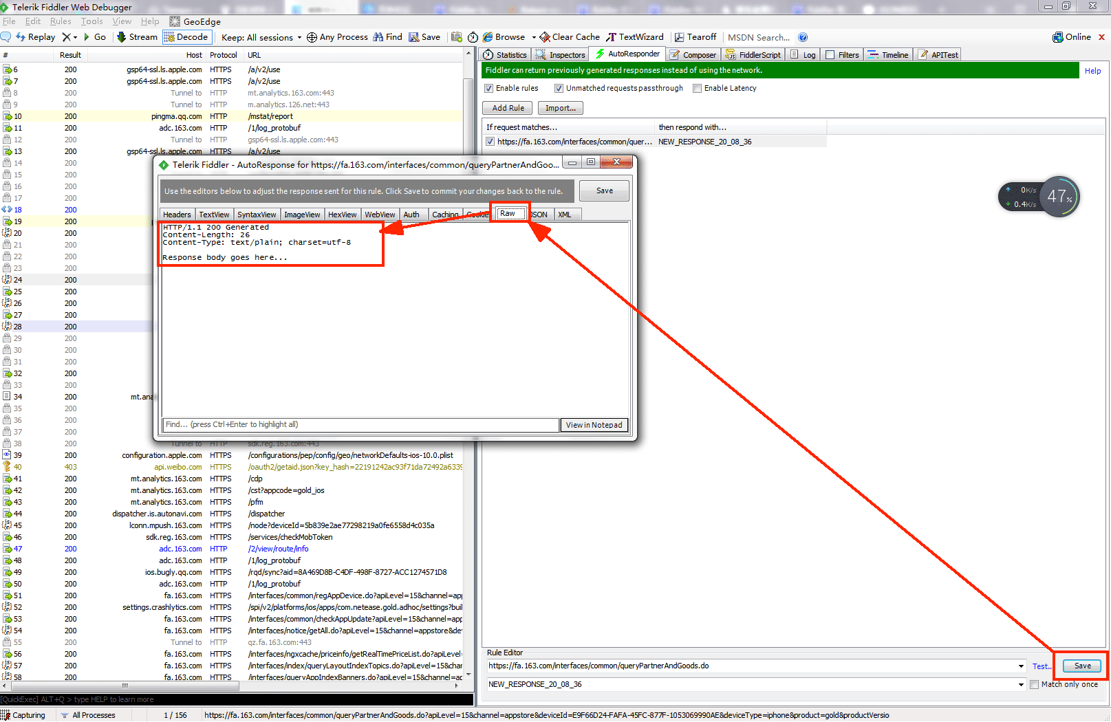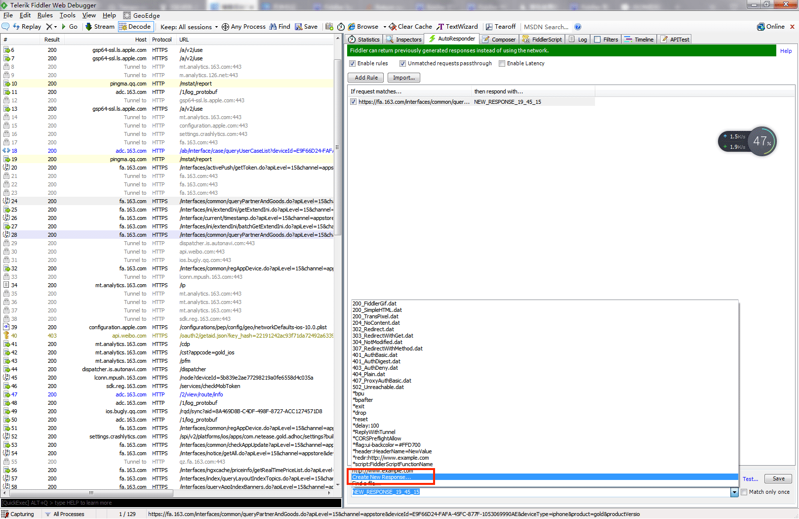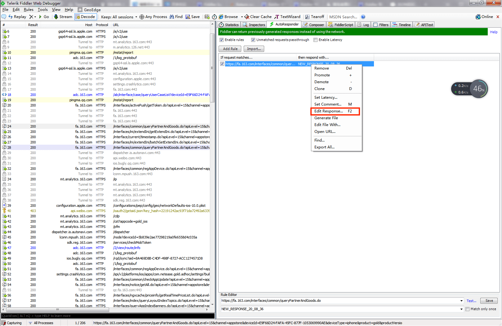 4. 如果想要频繁修改替换返回体中某些内容,可以在AutoResponder里相应待拦截请求上点击右键,“Edit Response”编辑返回体: