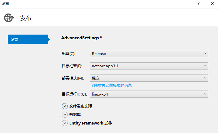 由于目标是linux系统,因此需要选择目标运行时为linux-64,部署模式选择独立。(阿里云暂时没有配置.NET Core 3.1 Runtime,需要自带运行组件,但是不要选择单一文件,实测有问题)。