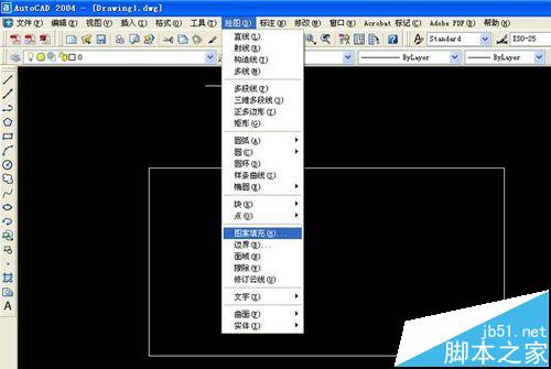 1、打开CAD软件,绘制封闭区域,比如用矩形绘制一个长方形。然后单击菜单栏下的【图案填充】。