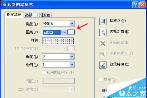 2、在弹出的【图案填充】的窗口上进行选取图案,可以找默认的。鼠标左键单击如图箭头所指的按钮。