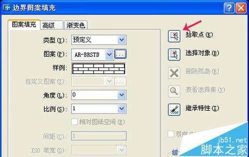4、选择好图案后,鼠标左键单击如图所示的箭头所指的按钮,【拾取点】。如果这里没有拾取,则无法完成绘制。