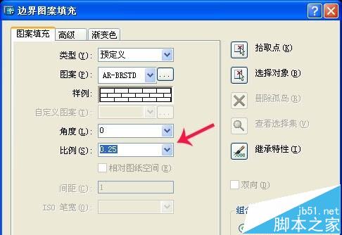 6这时又返回图案填充的窗口上,在箭头所指处,修改下比例,默认是1,将其改为0.25,则更像墙壁些,最后单击【确定】,这时再返回主窗口看到,很漂亮的封闭围墙绘制好了。