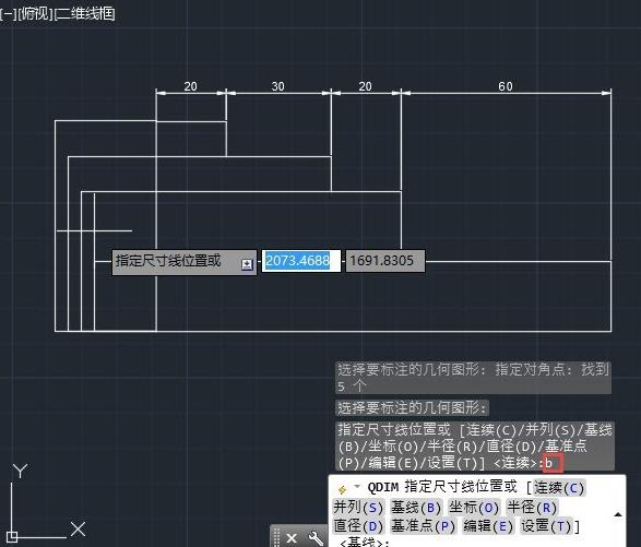 4、回车,重复执行快速标注命令,再次框选这些图形,向左或右侧拖动,观察命令行显示的选项,输入B,回车,将标注变成基线形式,如图所示。