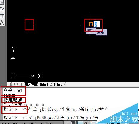 2、然后我们输入“pl”命令,回车,在cad中确定起点,然后再确定下一点,即线段的端点(这一步其实就是话箭头的直线部分,cad直接话直线段即可)