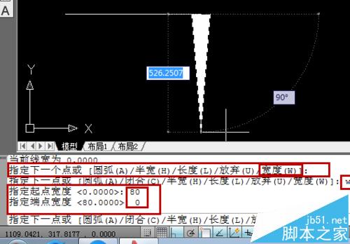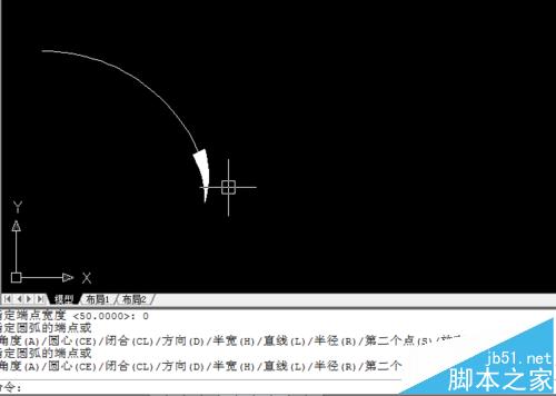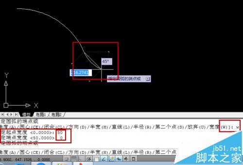 3、紧接上一步,输入w,回车,然后指定两个端点的宽度,输入“50”,回车,再输入“0”,回车即可,如图所示,最后用鼠标确定箭头的端点,点“Enter”键确定