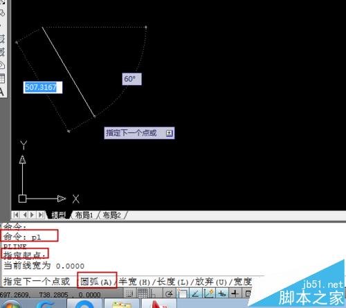 1、弯曲箭头的绘制,这里不用开“正交”命令,直接输入“pl”命令,回车,在cad中确定起点,这时不能急着定第二个点,因为我们画弯曲箭头,所以在下方的“指定下一点”,我们要选择"A”
