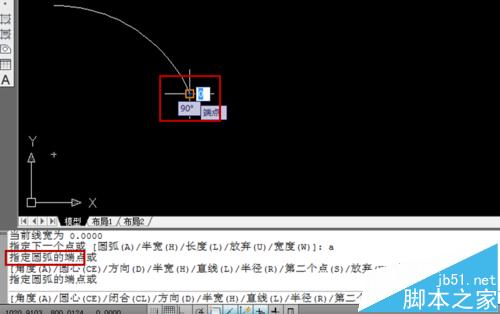 2、紧接上一步,输入a,回车,然后指定圆弧的下一点,确定圆弧点后,看到下方命令栏中,我们要选择"w"