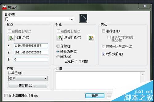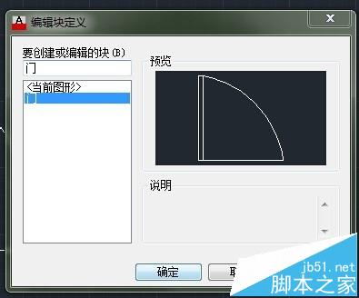 2、执行“创建块”命令(B),将门对象创建为图块,创建图块的名称为“门”。