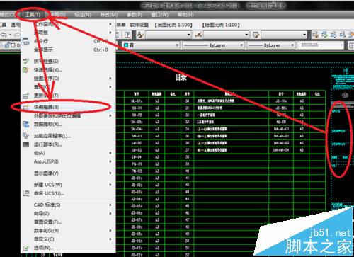 3、先单击选中图框,点击菜单栏中的“工具”,弹出下拉菜单,在下拉找到“块编辑器”,如下图所示: