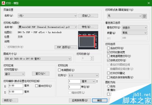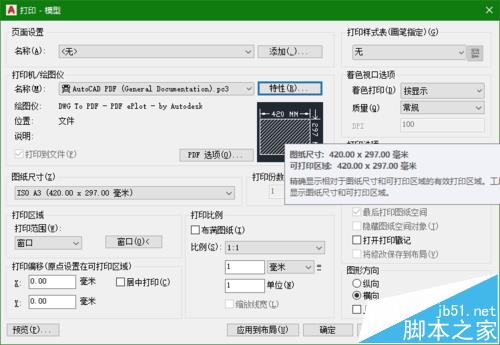 2、选择打印机,图纸尺寸,打印范围(窗选,手动选择);这时候我们看到中间那个小预览窗有红色,代表无法打印区域;