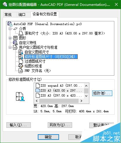 3、注意到关键地方啦,点击小预览窗上面的“特性”,进入编辑器,选择“用户定义图纸尺寸与校准”下面的“修改标准图纸尺寸(可打印区域)”;在下面找到你所需要的图纸尺寸,点击修改