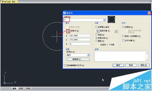 1、新建一张图纸,画一个圆,输入B,回车,将圆定义成图块,块名设置为1,插入点设置在圆的圆心,如下图所示。