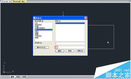2、在左侧的列表中选择“块”,在右侧的列表中选择“1”,在“重命名”框内输入2,如下图所示,单击确定按钮,将图块名从1改成2 。