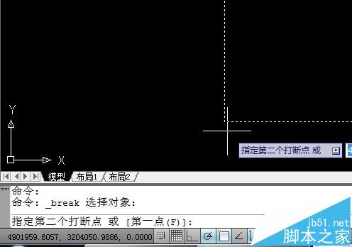 4、点“打断”命令后,显示"选择对象",选择要打断的对象,然后出现“指定第二个打断点或[第一点(F)]”,写f
