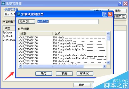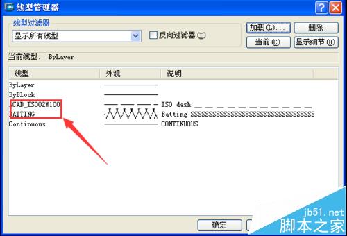 7、在加载或重载线型对话框内找到我们需要的线型,点击确定,可以看到我们的线型管理器对话框里就增加了线型,如图所示: