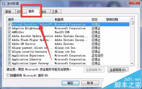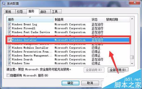 3、最后,在电脑“系统配置”窗口找到“服务”,然后在“服务”窗口下找到“windows installer”设置选项,然后将其“禁用”,如图