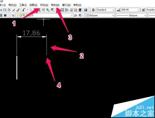 4、接下来我们需要画剖切符号的箭头。点击菜单栏的“标注”→“线性”,随便画一条长度适当的标注。之后再在菜单栏选择“修改”→“分解”,选中刚才画的长度标注,使标注的各个部分分解开来。