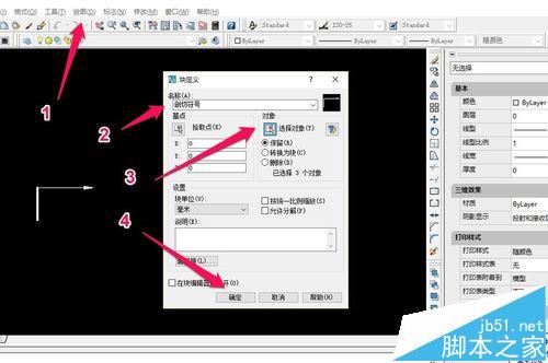 1、由于剖视符号我们经常会用到,所以我们可以把它保存为块,以便下次继续使用。我们点击“绘图”→“块”→“创建”,系统弹出如图界面。在最上方输入名称,然后点击“选择对象”,选中我们刚才画的剖切符号,然后选择确定。这时候剖切符号就保存为块了。