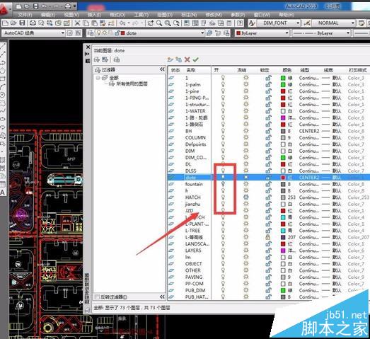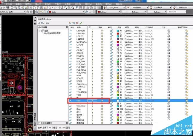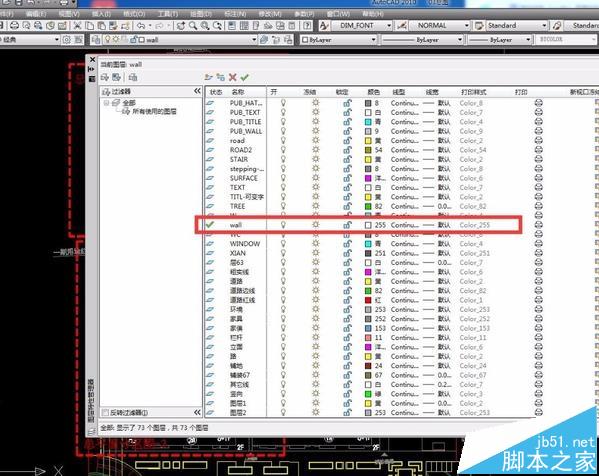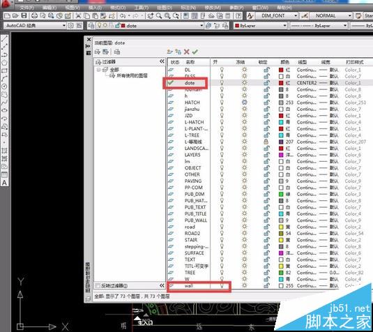 6、双击“状态”下的蓝色平行四边形便可以将选中的图层置为当前图层。比如将“dote”置为当前。此时“wall”图层将不再为当前图层,“dote”图层的状态也由平行四边形变成了对勾。对勾即表示“当前图层”。
