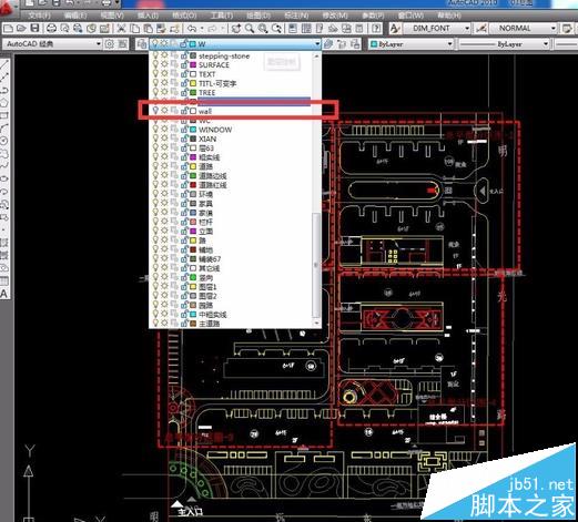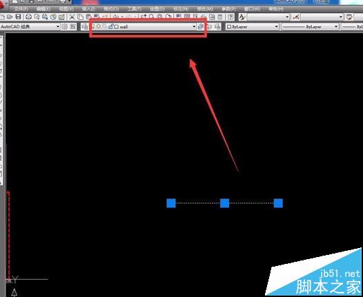 9、比如在图层管理器中将“wall”这个图层关闭,则刚刚画的直线就不再显示,重新打开之后,又能显示出来。