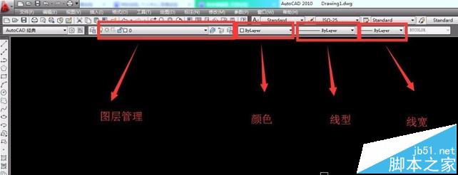 1、如下图所示,AutoCAD上方工具栏中的默认图形管理器有“图层管理、颜色、线型、线宽”几个选项,下面来依次介绍各个工具的具体使用方法。