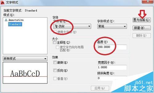 3、调整文字样式:文字样式的快捷键是ST空格。cad图中的文字样式都是有规定的,选择仿宋字体,把字高设为200。并置为当前。