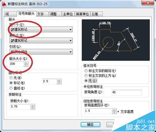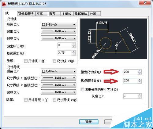 4、标注样式:快捷键D空格呼出标注样式管理器,点击修改,调整线,符号和箭头,这里也可以调整文字样式。线中超出尺寸线,起点偏移量都设为200,设为建筑标记,箭头为200。置为当前。