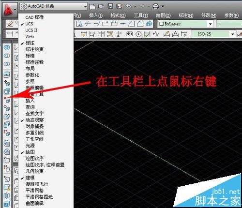 2、把需要使用的快捷工具栏调出来。方法:在工具栏上点鼠标右键,在需要的工具前打勾,然后按住鼠标左键拖动到方便点击的位置。经常使用的三维建模工具有:建模,实体编辑,视觉样式,视图,UCS(改变坐标系)