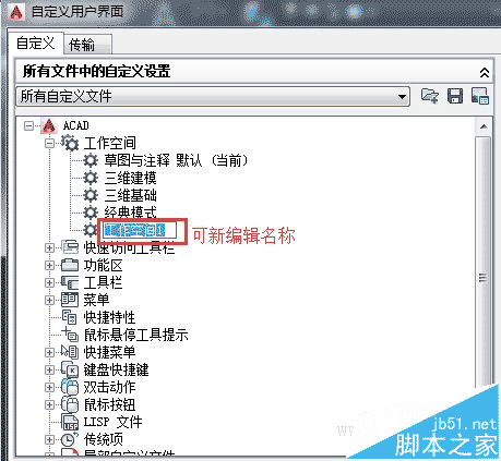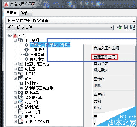 2、点击“自定义”之后,弹出下图界面,在蓝色框内右击后,弹出子菜单,点击“新建工作空间”