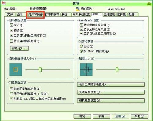 3、选择选项菜单以后,选项窗口出现,用鼠标点击上面的打开和保存按钮