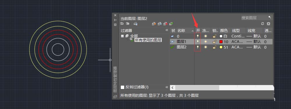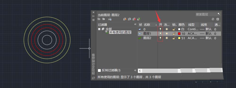 6、修改完成后,我们分别使用三个图层的线绘制各两个圆。注意图层管理器每个图层都有一个小灯泡。