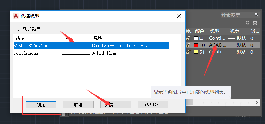 5、点击图层管理器图示位置,然后在点击load,可以加载自己想要的线型,进行修改。