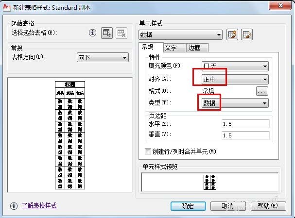 2、单击【继续】按钮,打开【新建表格样式:Table】对话框,在【单元格样式】选项区域的下拉列表框中选择【数据】选项,将【对齐】方式设置为【正中】;将【线宽】设置为0.3mm;设置文字样式为大字体gbcsig.shx,高度为5mm。