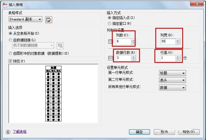 5、在【功能区】选项板中选择【注释】选项卡,在【表格】面板中单击【表格】按钮,打开【插入表格】对话框,在【插入方式】选项区域中选择【指定插入点】单选按钮;在【列和行设置】选项区域中分别设置【列数】和【数据行数】文本框中的数值为6和3;在【设置单元样式】选项区域中设置所有的单元样式都为【数据】