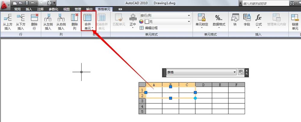 7、选中表格中的前2行和前3行列表单元,在【功能区】选项板中选择【表格】选项卡,在【合并】面板中单击【合并单元】按钮,在弹出的菜单中选择【合并全部】命令,将选中的表格合并为一个表格单元