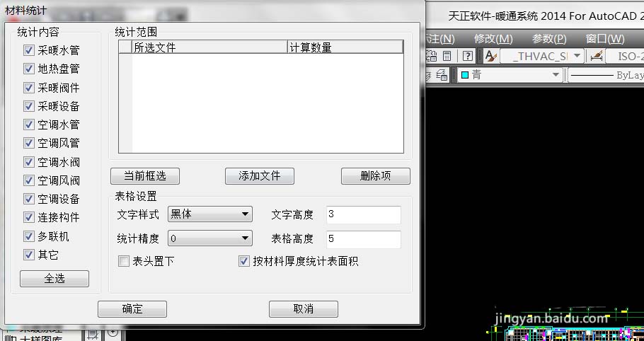5、等所有风管及阀部件全部描完以后,点击天正暖通左侧“采暖”菜单栏下的“材料统计”菜单,将需要统计的材料名称勾选,勾选上“按材料厚度统计表面积”统计出的风道量是表面积,不勾选则统计的是各规格型号的长度