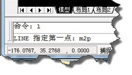 2、这个命令不能独立使用,在定位点的任何命令提示下才能使用。mtp 或 m2p,其实我们可以猜到是 :middle point of 2 points,两点连线的中点。
