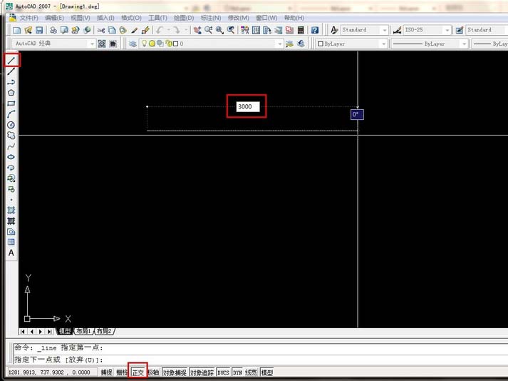 3、首先我们要测量好房间的尺寸,画好草图之后就可以开始制作了。我们先来看怎么画直线。左侧工具面板第一个就是直线,这里要注意画直线要选择“正交”,“正交”没有打开画的就是斜线。图中红色框住的地方是我们要注意的。